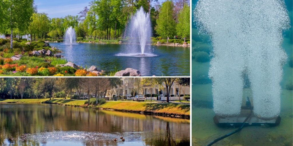 - Submersed aerators – Ideal for waterbodies over 6 feet deep, they pump air to the bottom through bottom diffusers. As air bubbles rise, they help circulate and oxygenate the water column.