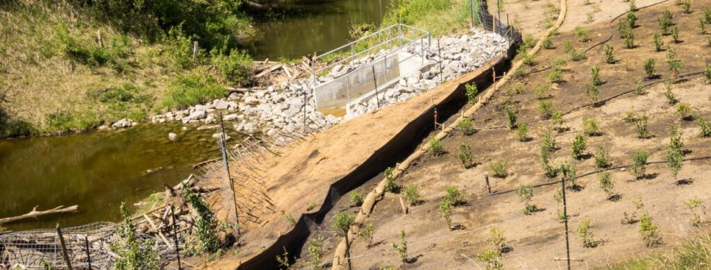 Long tubes made from natural fibers that help improve stability while promoting the growth of native grasses and vegetation.