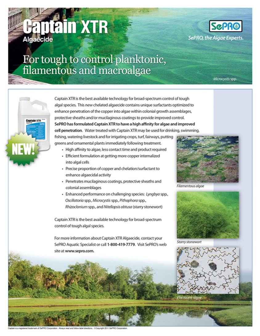 Our partners at SePRO Corporation have done it again…introducing the latest revolution in the fight against algae…Captain XTR. We are excited to have the opportunity to work with SePRO to bring this product to market, and look forward to implementing where necessary in our lake and pond management strategies. Over time, certain strains of harder to control algae have become more predominant, and this new tool will assist us in our control efforts where other products have failed.