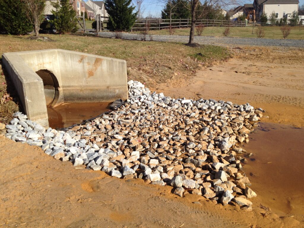 Large rocks are often placed around outflows to slow water and prevent erosion. Inspectors keep an eye out for areas where rocks are missing or displaced.